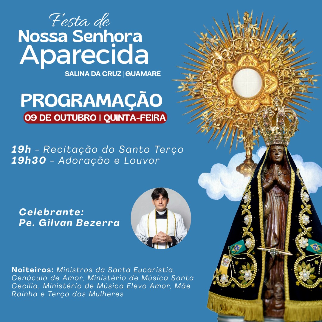 ¦ ✨💙 Programação da Festa de Nossa Senhora Aparecida 2025. É com grande alegria que anunciamos a Festa de Nossa Senhora Aparecida na comunidade de Salina da Cruz, nos dias 08 a 12 de Outubro! Que tem como tema: "Com Maria, Mãe da esperança, conhecer Jesus e cuidar da vida.". Convidamos toda a comunidade para se fazer presente e louvarmos em comunhão a Mãe Aparecida! Nossa Senhora Aparecida, rogai por nós! ✨