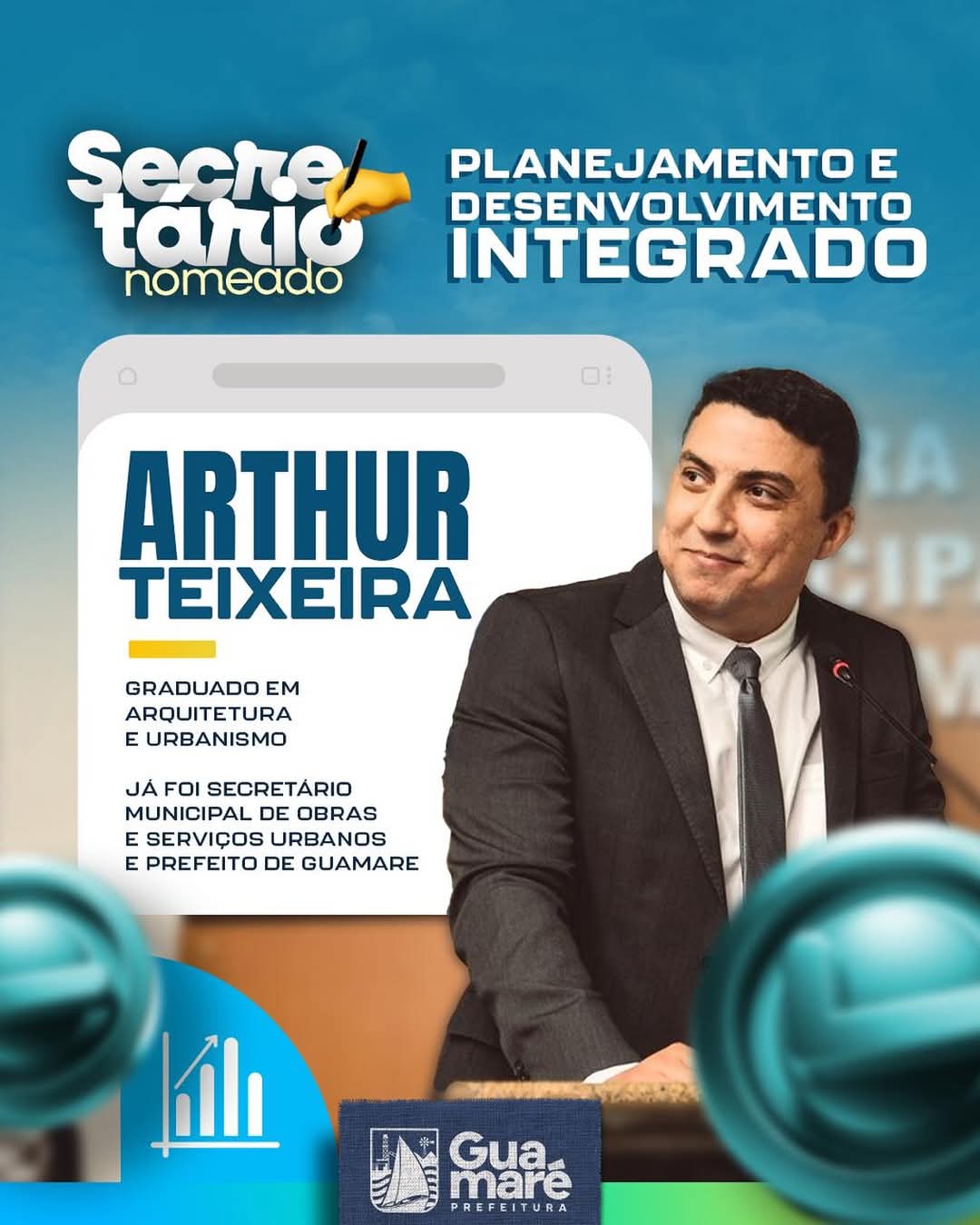 O PREFEITO DO MUNICÍPIO DE GUAMARÉ/RN, Hélio Willamy Miranda da Fonseca, no uso de suas atribuições legais e da competência que lhe foi conferida pelo art. 45 da Lei Orgânica do Município; RESOLVE: Art. 1º – Nomear, ARTHUR HENRIQUE DA FONSECA TEIXEIRA, nas atribuições inerentes ao cargo comissionado de Secretário Municipal, lotado (a) no (a) Secretaria Municipal de Planejamento e Desenvolvimento Integrado.