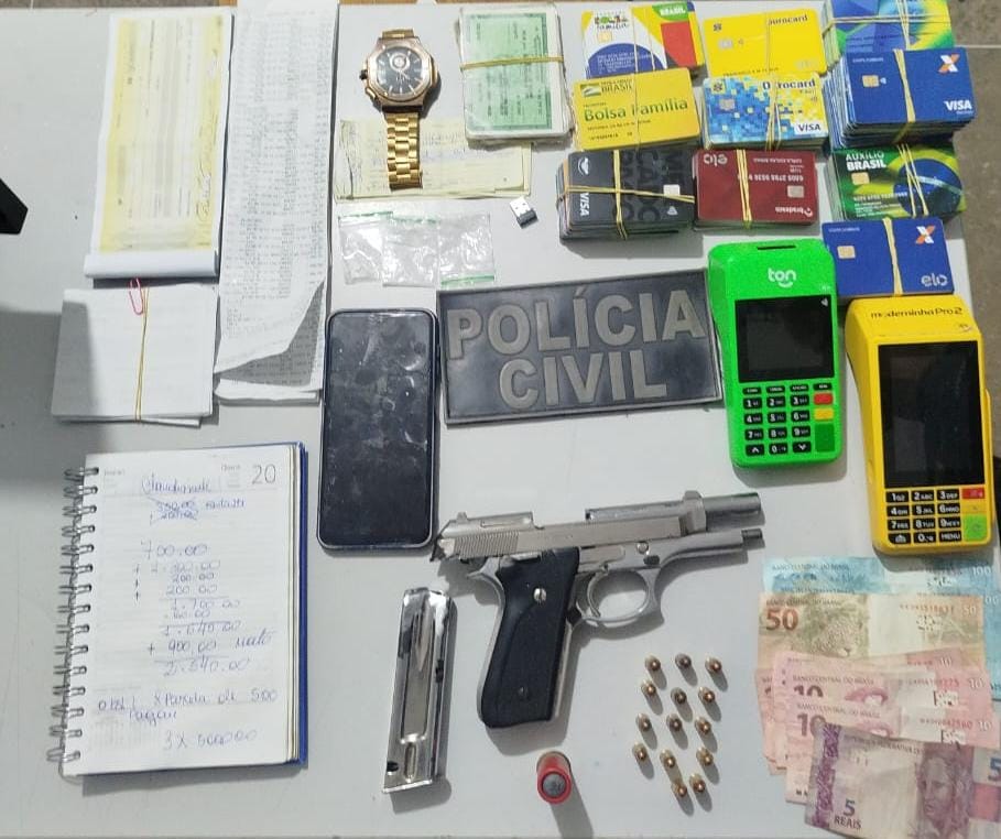 No quarto endereço, ligado a um dos financiadores do esquema, foram apreendidos uma pistola com numeração suprimida, uma munição calibre 12, entorpecentes, dinheiro em espécie e aproximadamente 200 cartões bancários e sociais, como Bolsa Família e cartões de crédito. O suspeito foi autuado em flagrante pelos crimes de agiotagem, posse ilegal de munição de uso permitido, posse de arma com numeração raspada e porte para consumo pessoal de drogas. De acordo com a polícia, ele emprestava dinheiro a juros abusivos e retinha os cartões das vítimas como garantia de pagamento.